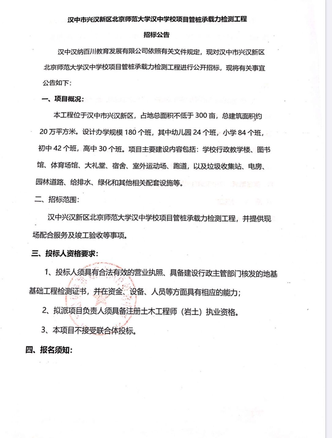 漢中市興漢新區(qū)北京師范大學(xué)漢中學(xué)校項目管樁承載力檢測工程招標公告  漢中漢納百川教育發(fā)展有限公司...